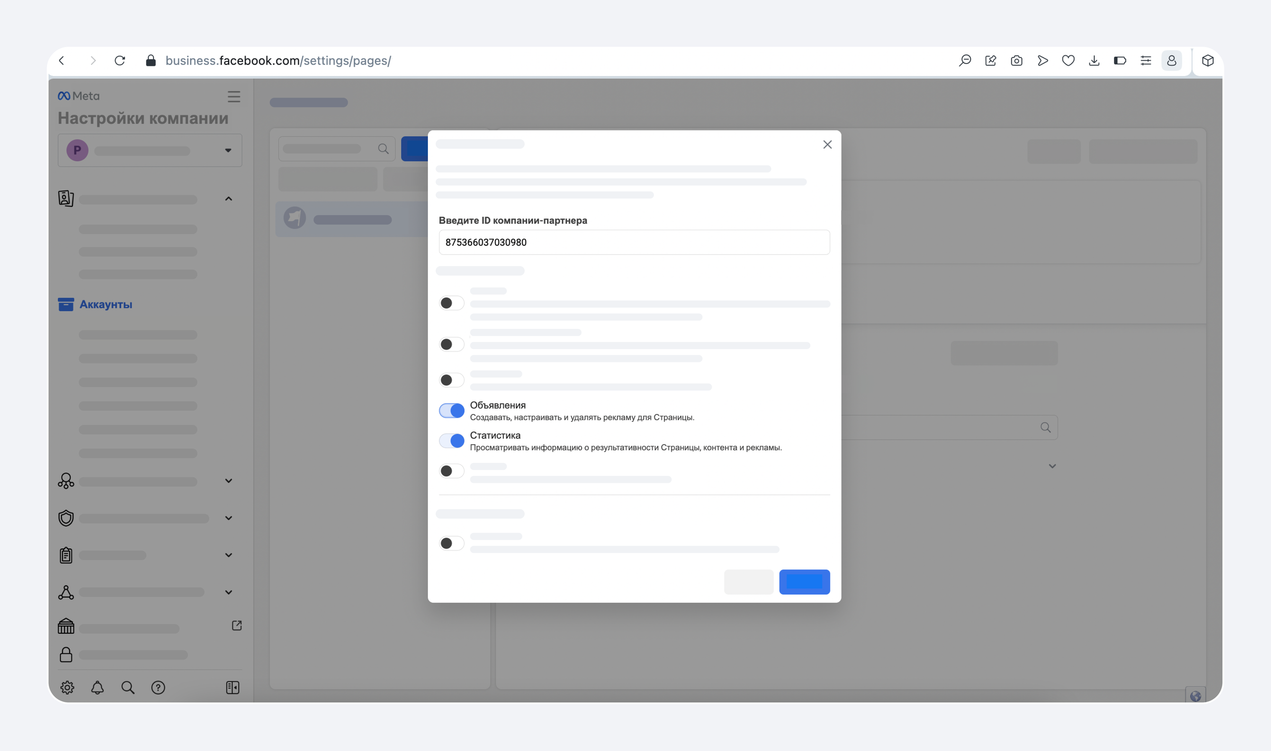 В открывшемся окне введите ID Яндекс Бизнеса — 875366037030980. И нажмите переключатели «Создание рекламы» и «Просмотр статистики дохода», чтобы они стали активными.
